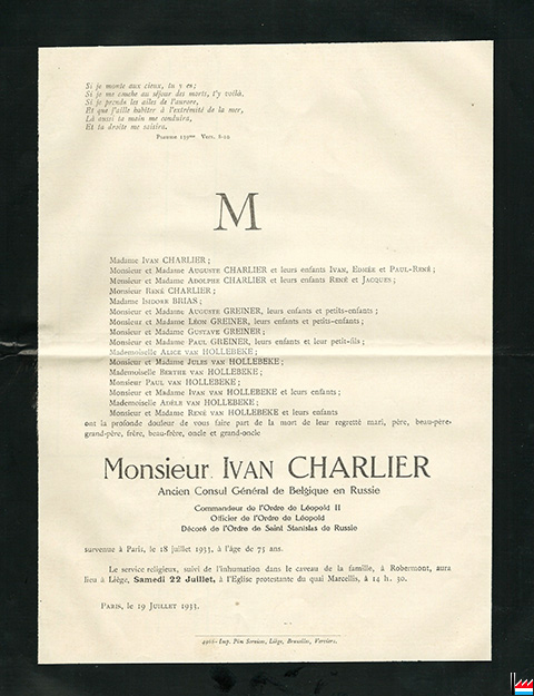Monsieur Ivan Charlier, ancien consul général de Belgique en Russie, commandeur de l’Ordre de Léopold II, officier de l’Ordre de Léopold, décoré de l’Ordre de Saint Stanislas de Russie.