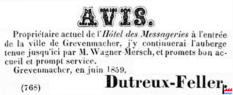 Als nunmehriger Eigentümer des in der Trier’schen Straße, im Eingang der Stadt Grevenmacher gelegenen Hôtel des Messageries, werde ich die bis dahin in dem Hause von Hrn. Wagner-Mersch betriebene Gastwirtschaft fortführen und verspreche allen verehrlichen Kunden einen freundlichen Empfang und flotte, prompte Bedienung. Grevenmacher, im Juni 1859. DUTREUX-FELLER |