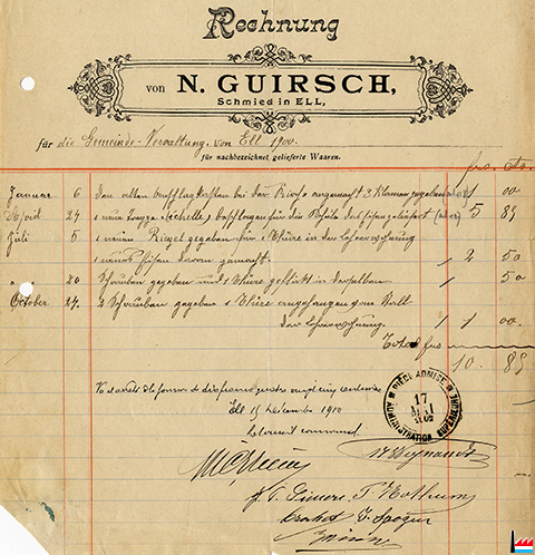 | 1900 | ![]() Guirsch N., Schmied in Ell - Rechnung - 1900 (digitaalt Archiv Romain Gaspar) |