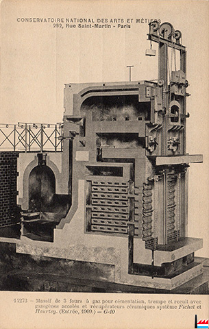 ![]() Massif de 3 fours à gaz pour cémentation, trempe et recuit avec gazogènes accolés et récupérateurs céramiques système Fichet et Heurtey - <=1909 (Carte postale: Collection: industrie.lu) |