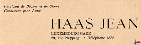 | 1948/49 | Fabricant de bâches et de stores Haas Jean 29 rue Neyperg Luxembourg Tél 6535 |