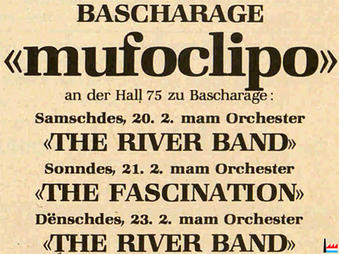 | 2,1982 | ![]() mufoclipo an der Hall 75 zu Bascharage (Revue: 20.2.1982) 20.2.1982, 23.2.1982: The River Band 21.2.1982:The Fascination |