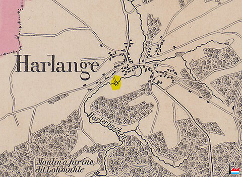 | 1862 | ![]() Betlange - Moulin à farine, dit Lohmühle, Harlerbach - Hareler Millen, Harlange (Carte Jean-Baptiste Liesch - 1862) |