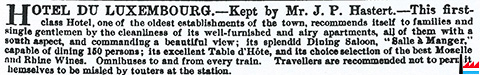 1853: Hotel du Luxembourg. - Kept by Mr. J. P. Hastert. - … - Advertisement Luxembourg (Bradshaw’s illustrated hand-book to Switzerland and the Tyrol with beautiful clear steel engraved map of the country, and plans of the town, &., 1853)