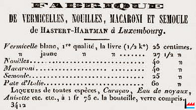 | 1849 | ![]() Fabrique de vermicelles, nouilles, macaroni et semoule de Théodore Hastert - Hartmann (* 13.9.1794, fils de Pierre Hastert) à Luxembourg Grand'Rue 114 (1846) (Courrier du Grand-Duché de Luxembourg N° 35 - 2.5.1849) |