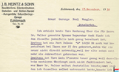| <=1930 | ![]() Bauschlosserei - Eisenkonstruktion - Stabeisen-Handel - Kohlen-Handel - Autogenische Schweißanlage - Garage Heintz J.B. & fils, Echternach, tél: 88 - 1930 (Collection: industrie.lu) |