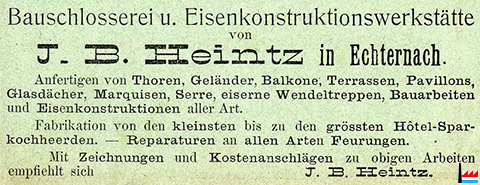 Heintz J.B., Echternach, Bauschlosserei und Eisenkonstruktionswerkstätte Toren, Geländer, Balkone, Terrassen, Pavillons, Glasdàcher, Marquisen, Serre, eiserne Wendeltreppen, Bauarbeiten und Eisenkonstruktionen aller Art Fabrikation von den kleinsten bis zu den größten Hotel-Sparkochherden |
