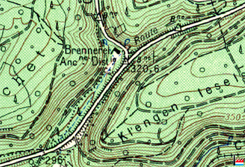 Brennerei zwischen Dommeldingen und Waldhof, bei Abzweigung nach Stafelter (Staffelstein) - Ancienne distillerie - © Origine Administration du Cadastre et de la Topographie Luxembourg (ACT) - Extrait de la carte topographique à l'échelle 1: 25.000 édition 1954 - Autorisation de publication du 20.10.2010.»