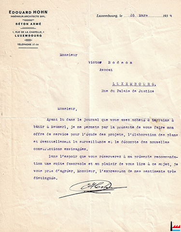 Edouard HOHN Ingénieur - Architecte dipl. 1, Rue de la Chapelle Téléphone 37-54 - Luxembourg Projets - Devis - Calculs - Surveillance - Décomptes - Expertises - Arbitrages de toutes constructions civiles et industrielles. NB. Bureau d'Etudes pour béton armé. (LW : 9.8.1933) |