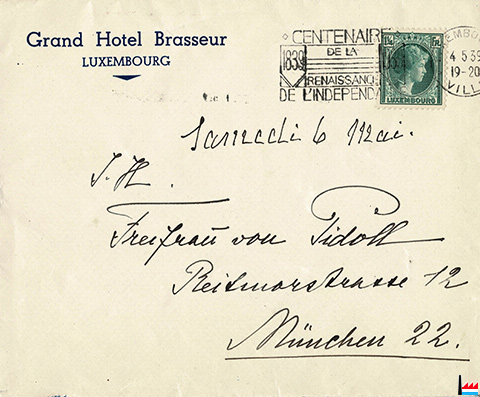 | 5.1939 | ![]() Briefumschlag Grand Hotel Brasseur - Luxembourg an Freifrau von Pidoll, München 22, Reitmorsstrasse 12 (Collection: industrie.lu) Centenaire de l'Indépendance 1839 - 1939 |