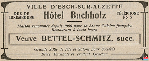 | 1921 | Hôtel Buchholtz, Esch/Alzette, 16 rue de Luxembourg, propr. Nicolas Oestreicher |