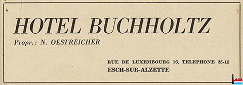 | <=1948/49 | ![]() Hôtel Buchholtz, Esch/Alzette, 16 rue de Luxembourg, tél: 2515, propr. N. Oestreicher (Collection: industrie.lu) |