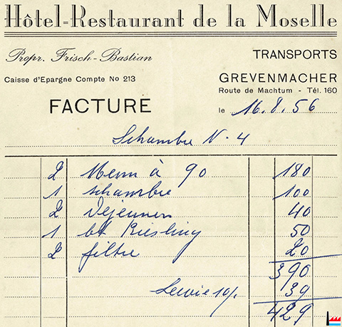 | <=1956 | ![]() Hôtel de la Moselle - Frisch-Bastian, Grevenmacher, route de Machtum, tél: 160 - transports - 1956 (Collection: industrie.lu) |