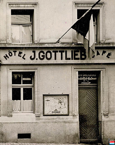Hôtel International - Café - Hôtel J. Gottlieb, Echternach, Jos. Gottlieb-Kallmann (Extraits de la photo d'épreuve: 4904B (texte 4703 (ancien) - A. Montmorency, 56 Bd Adolphe Max, Bruxelles; collection: industrie.lu)
