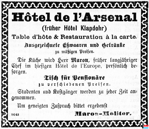 | 1.8.1885 | ![]() Ouverture de l'Hôtel de l'Arsenal (ancien Hôtel Klapdohr), 24 avenue de l'Arsenal, Maron-Molitor, früher langjähriger Chef im Hôtel de l'Europe, Luxemburg (LIL: 29.9.1885) |