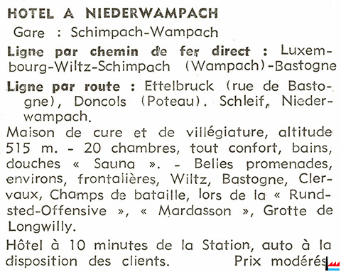 | <=1958 | Hôtel Klein - Theissen, Niederwampach Tél: 10 (en cas d'absence appeler Luxembourg N° 25629, Voelker-Klein) |
