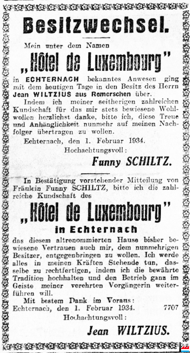 Daselbst wurde seit mehr als 50 Jahren Café, Restaurant und Hotel mit bestem Erfolg betrieben. Die Gebäulichkeiten sind von neuer, moderner und sehr solider Konstruktion. Bis zum Tage der Versteigerung kann das Hotel aus freier Hand erworben werden. Zwecks Besichtigung wende man sich an die Eigentümer WILTZIUS-LALLEMANG, Remerschen, Tel. 26, oder an Herrn Arthur SCHWARTZ-WILTZIUS, Echternach, Tel. 151. Anschließend lassen dieselben Eigentümer versteigern: Einen STALL, gelegen zu Echternach, in der Bindergasse, zwischen Schaminé und Limpach-Schiltz, groB 41 Centiar. Paul DUMONT, Notar, Echternach. (t: 1.4.1950) |
