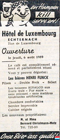| 1.7.1950 - 1959 | ![]() Hôtel de Luxembourg, Echternach, 36 rue de Luxembourg (t: 1.7.1950) Nouveau propriétaire: Jean Wiard - Metz, tél: 72290 Bières Henri Funck |