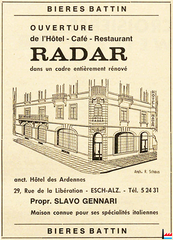 | >=1934, 1935 | ![]() Hôtel des Ardennes, Esch/Alzette, rue Neuve (Carte postale: Collection: industrie.lu) Lanners - Reiser Vue du croisement de la rue de l'Alzette avec la rue de la Libération (anc. rue Neuve) |