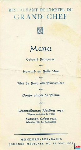 | 10.5.1959 | ![]() Restaurant de l'Hôtel du Grand Chef - Mondorf-les-Bains - Menu - Journée médicale du 10 mai 1959. (Collection Philippe Aschman) |