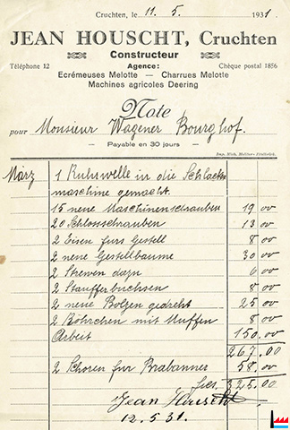 | <=1931 | ![]() Jean Houscht à Cruchten, constructeur (Collection: industrie.lu) Tél: 12 Agence: Ecrémeuses Melotte, charrues Melotte, machines agricoles Deering |