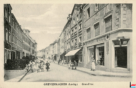 Grevenmacher, Grand'rue (Carte postale: No. 9 Maison de gros P. Houstraas, Luxembourg & Metz; Collection: industrie.lu)