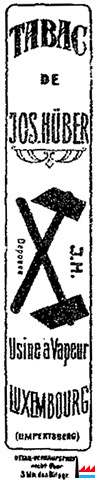 | 8.1910 | Immeuble. La fabrique de cigares (ancienne maison Renquin) au Limpertsberg, dont le propriétaire M. Huber avait fait faillite, a été rachetée par Monsieur Duren-Warkin au prix de 28.000 francs. M. Duren l’avait vendue à Monsieur Huber au prix de 75.000 francs. (LIL: 13.8.1910) | ||