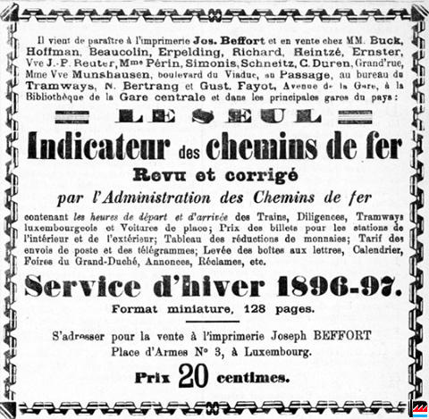 | 12.1896 | ![]() Le seul indicateur des chemins de fer (LIL: 11.12.1896) Revu et corrigé par l'Administration des Chemins de fer contenant les heures de départ et d'arrivée des Trains, Diligences, Tramways luxembourgeois et Voitures de place; Prix des billets pour les stations de l’intérieur et de l’extérieur; Tableau des réductions de monnaies; Tarif des envois de poste et des télégrammes; Levée des boîtes aux lettres, Calendrier, Foires du Grand-Duché, Annonces, Réclames, etc. Service d’hiver 1896-97 Format miniature, 128 pages. S'adresser pour la vente à l’imprimerie Joseph BEFFORT Place d’ Armes N° 3, à Luxembourg. Prix: 20 centimes Il vient de paraître à l’imprimerie Jos. Belfort et en vente chez MM. Buck, Hoffman, Beaucolin, Erpelding, Richard, Heintzé, Ernster, Vve J. -P. Reuter, Mme Périn, Simonis, Schneitz, G. Duren, Grand’rue, Mme Vve Munshausen, boulevard du Viaduc, au Passage, au bureau du Tramways, N. Bertrang et Gust. Fayot, Avenue de la G»re, à la Bibliothèque de la Gare centrale et dans les principales gares du pays |
