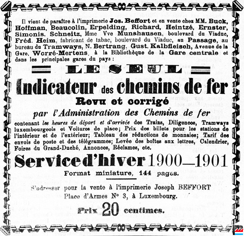 | 10.1900 | ![]() Le seul indicateur des chemins de fer Revu et corrigé par l'Administration des Chemins de fer contenant les heures de départ et d'arrivée des Trains, Diligences, Tramways luxembourgeois et Voitures de place; Prix des billets pour les stations de l’intérieur et de l’extérieur; Tableau des réductions de monnaies; Tarif des envois de poste et des télégrammes; Levée des boîtes aux lettres, Calendrier, Foires du Grand-Duché, Annonces, Réclames, etc. Service d’hiver 1900 - 1901 Format miniature, 144 pages. S'adresser pour la vente à l’imprimerie Joseph BEFFORT Place d’ Armes N° 3, à Luxembourg. Prix: 20 centimes En vente chez MM Buck, Hoffman, Beaucolin, Erpelding, Richard, Heintzé, Ernster, Simonis, Schneitz, Mme Vve Munshausen, boulevard du Viaduc, Fréd. Heim, fabricant de tabac, boulevard du Viaduc, au Passage, au bureau du Tramways, N. Bertrang, Gust. Kalbfleisch, Avenue de la Gare, Worré-Mertens, à la Bibliothèque de la Gare centrale et dans les principales gares du pays. (LIL: 2.10.1900) |