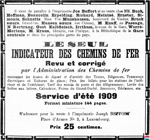 | 5.1909 | ![]() Le seul indicateur des chemins de fer (LIL: 7.5.1909) Revu et corrigé par l'Administration des Chemins de fer contenant les heures de départ et d'arrivée des Trains, Diligences, Tramways électriques et Voitures de place; Prix des billets pour les stations de l’intérieur et de l’extérieur; Tarif des envois de poste et des télégrammes; Levée des boîtes aux lettres, Calendrier, Foires du Grand-Duché, Annonces, Réclames, etc. Service d’été1909 Format miniature, 144 pages. S'adresser pour la vente à l’imprimerie Joseph BEFFORT Place d’ Armes N° 3, à Luxembourg. Prix: 25 centimes |