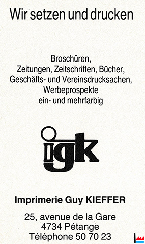 | <=1986 | ![]() Imprimerie Guy Kieffer, Pétange, 25 avenue de la Gare, tél: 507023 - 1986 (Collection: industrie.lu) |