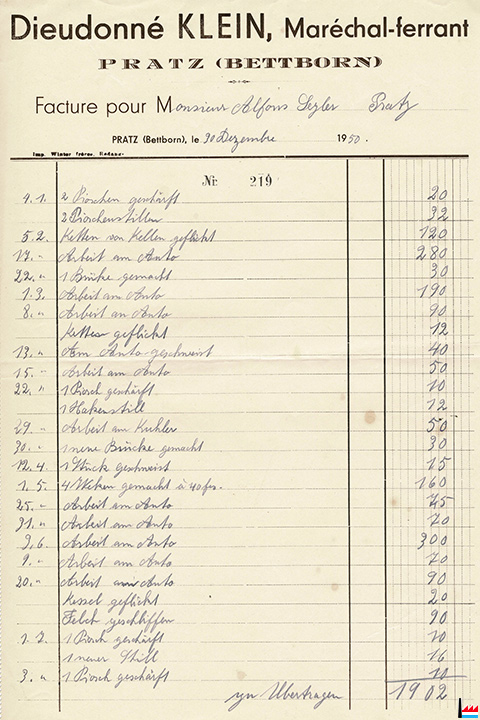 Dieudonné Klein, maréchal-ferrant, Pratz (Bettborn) (Facture pour Alfons Seyler, Pratz; Collection: industrie.lu)