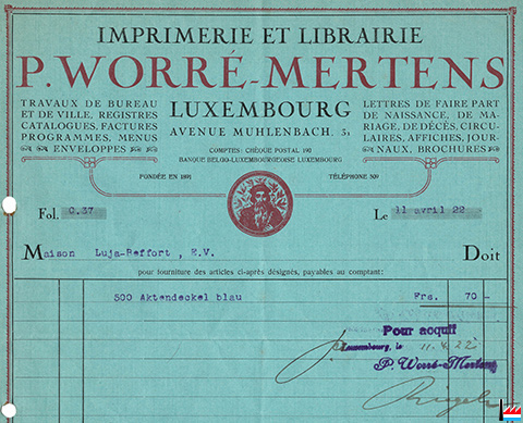 | <=1922 | ![]() Imprimerie et Librairie P. Worré-Mertens, Luxembourg, 31 avenue Muhlenbach = 31 avenue Pasteur - facture du 11.4.1922 à Luja-Beffort, Luxembourg (Collection: industrie.lu) |