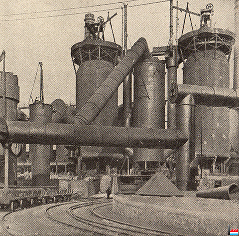 2 blast furnaces in an ironwork in Middlesbrough, UK (where exactly)? - 2 hauts fourneaux à Middlesbrough, Angleterre (Dans: Revue Universelle des Mines - N° 7 - 1942 ; Collection: industrie.lu)