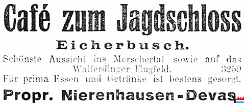 | <=8.1933 | ![]() Café zum Jagdschloss, Eicherbusch (LW: 12.8.1933) Prop. Nierenhausen - Devas Pierre Schönste Aussicht ins Merschertal sowie auf das Walferdinger-Flugfeld |
