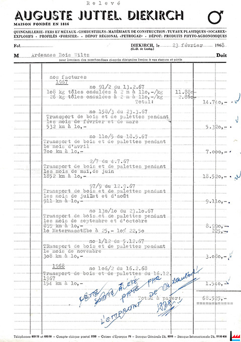 Relevé des factures du 23 février 1968 pour ARDENNES-BOIS, Wiltz (Collection Ph. Aschman)