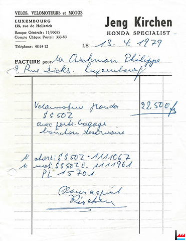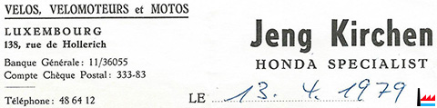 Jeng Kirchen - Honda specialist - Vélos, vélomoteurs et motos - 138, rue de Hollerich, Luxembourg (Facture du 13.4.1979 - Collection Philippe Aschman)
