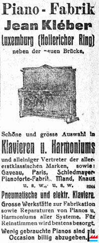 | 12.1917 | Les magasin de Pianos et Harmoniums J. Kléber sont transférés de nouveau 13 boulevard de Hollerich, près du nouveau pont |