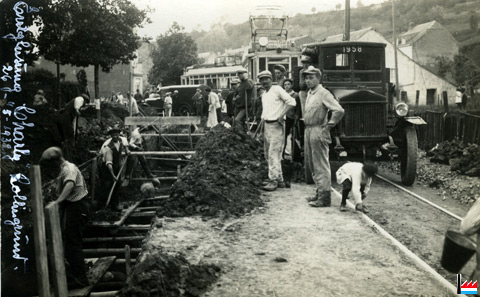 Entgleisung des Charly (TVL 30 + 31) wegen Kanalarbeiten, Rollingergrund - 26.5.1932 (rechts Café "Fixmesch Helen" / Mertens / Ewen / Godart und ganz rechts im Hintergrund das Haus Klomp) (Photo collection: Paul Schmit)