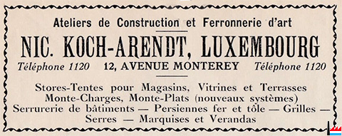 | <=1962 | Koch Paul, ateliers de constructions, serrurerie 18 avenue Monterey, Luxembourg 99-101 rue de Hollerich Tél: 23123 |