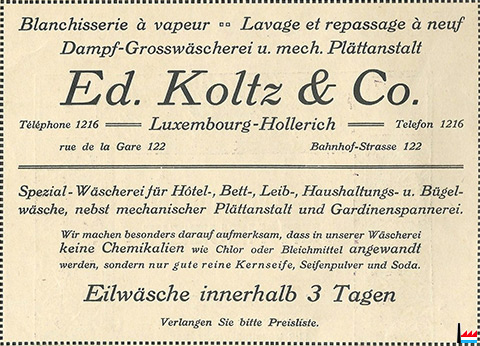 | 2.1912 | "Hiermit erlaube ich mir Ihnen ergebenst mitzuteilen, dass ich die Erste Luxemburger Dampf-Grosswäscherei und Mech. Plättanstalt J. Frenzel in Luxemburg-Hollerich übernommen habe. Ich mache besonders darauf aufmerksam, dass in der Wäscherei keine Chemikalien wie Chlor oder Bleichmittel angewandt werden, sondern nur gute Kernseife, Seifenpulver und Soda. (LW: 28.2.1912) |