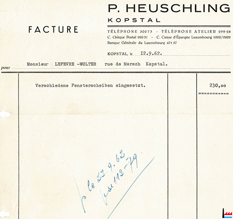 | <=1962 | ![]() Heuschling Paul, Kopstal, tél: 30073 - Atelier: 29928, peintre-décorateur (Collection industrie.lu) |