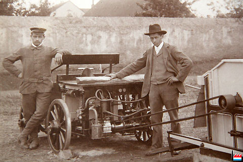 Erster Luxemburger Traktor (System Krack Welsdorf) beim Mähen in den Parkanlagen von Schloß Berg - 1912 (Photo: Christoph Krantz, Ettelbrück)