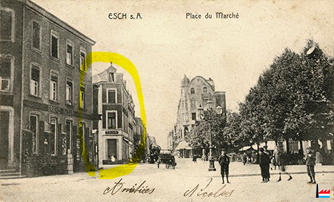 | <=1907 | ![]() Place du Marché, Esch/Alzette - <=1907 (Carte postale: G. Sluse, Marbrier, Esch/Alzette; Collection: industrie.lu) Grand Bazar Lichtenstein-Kleinberg - Librairie Kremer-Muller - Warenhaus Monopol |