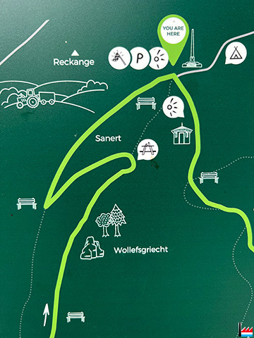 Um Krounebierg: Pavillon (0,2 km) - Mamerleeën (1,2 km) - Huellee (3,2 km) - Obelisk (40 m), Miersch - Mersch (Photo: 29.6.2022 jmo)