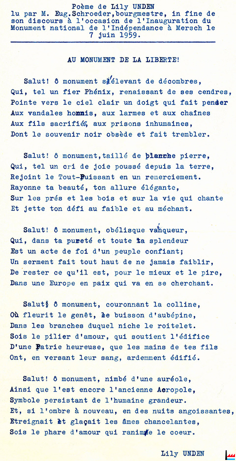![]() Poème de Lily Unden, lu par Eugène Schroeder, bourgmestre (Collection Nico Lucas) ![]() An das Merscher Freiheitsmal - Du bist - Cécile Ries (Collection Nico Lucas) |