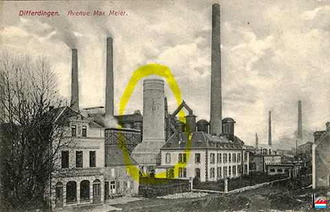 Kühltürme der Differdinger Hütte - Differdingen, Avenue Max Meier (Carte postale:6722 - Ed. Jose. Steichen, Bureau de Tabac - N° 451; collection: industrie.lu)