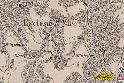 | 1862 | ![]() Esch/Sûre: Moulin à foulon (Oberste) - Filature de laine - Moulin à foulon (Unterste) - Tunnel - Neumuhl (Carte Jean-Baptiste Liesch - 1862) |