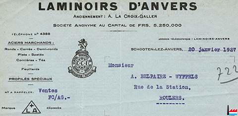 | 1948 | ![]() Action des Laminoirs d'Anvers - Antwerpse Ijzerpletterijen (Collection: industrie.lu) Siège social: Schloten - lez - Anvers |
