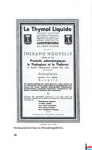 | 1938 | ![]() Le Thymol Liquide, 22, côte d’Eich, Luxembourg (LW: 14.6.1938) Thylobac - Thylosil - Thylovit |